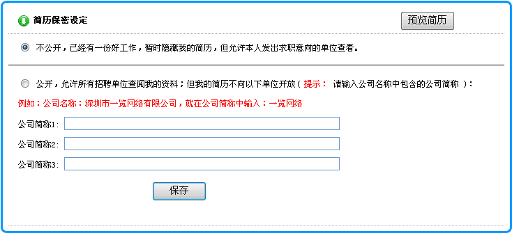2)在打開的頁面中,選擇 公開,允許所有招聘單位查閱我的資料;但我的簡(jiǎn)歷不向以下單位開放( 提示: 請(qǐng)輸入公司名稱中包含的公司簡(jiǎn)稱 ):按下圖所示,對(duì)號(hào)入座填入信息,點(diǎn)擊保存按鈕即可.